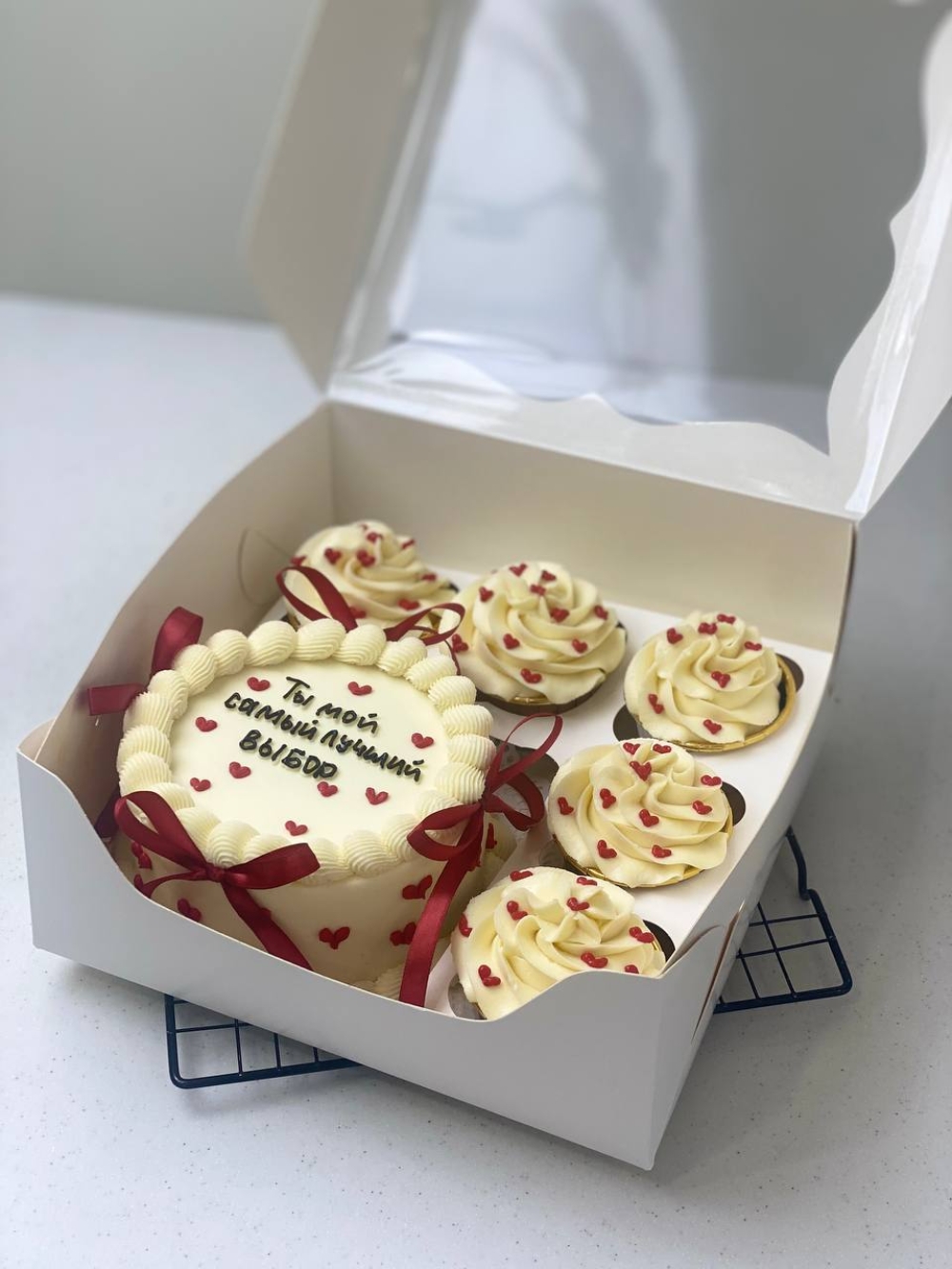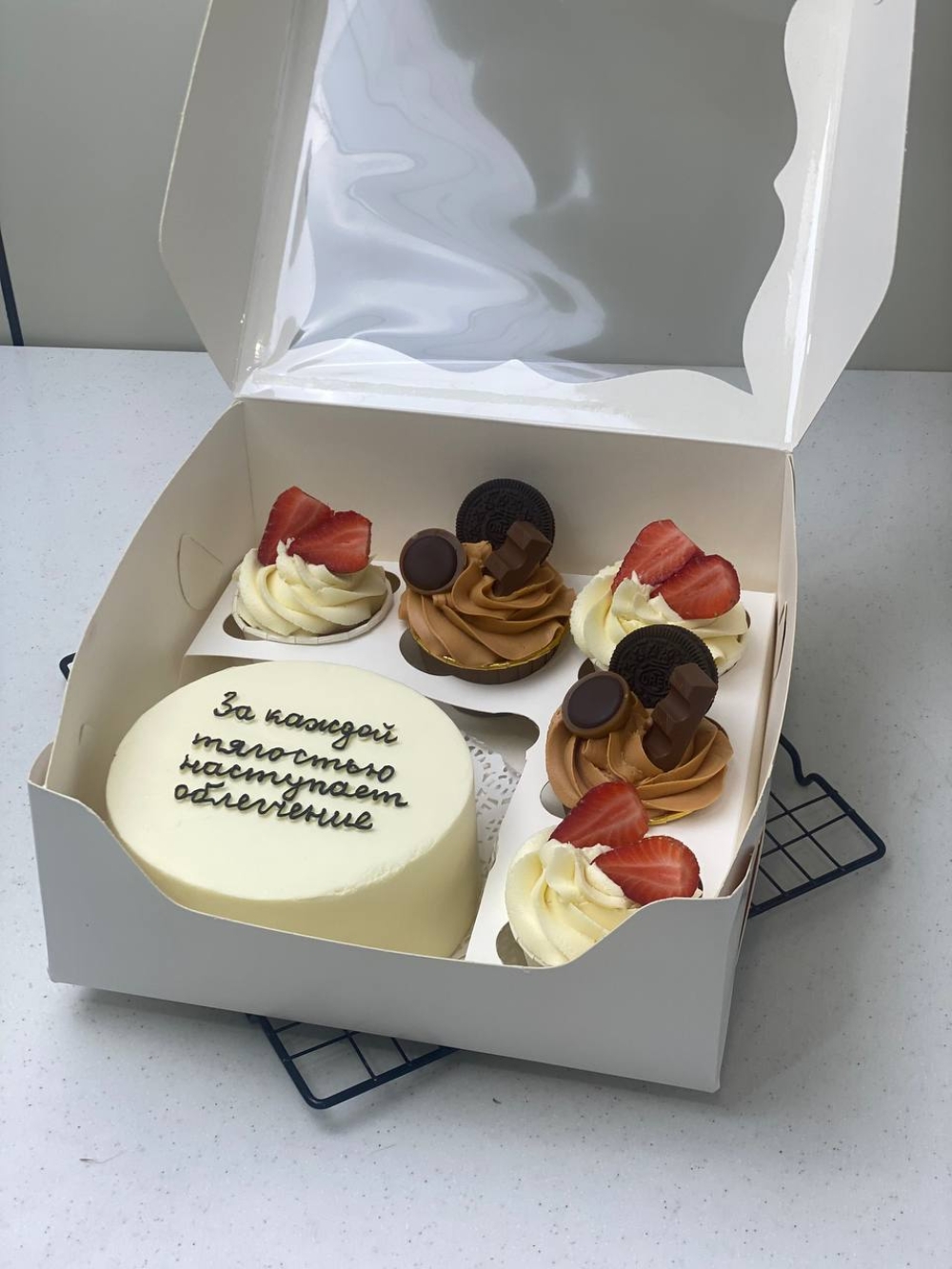 Бенто торт с капкейками — это идеальный мини-набор для маленького праздника, романтического вечера или уютного сладкого подарка. Аккуратный бенто-торт в индивидуальной коробочке дополняют нежные капкейки, украшенные в одном стиле.