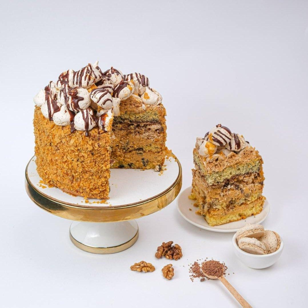 Три воздушных бисквитных коржа с грецким орехом, изюмом и маком, прослоенные нежным безе и насыщенным бельгийским натуральным шоколадом . Крем масляной с добавлением вареной сгущенки.